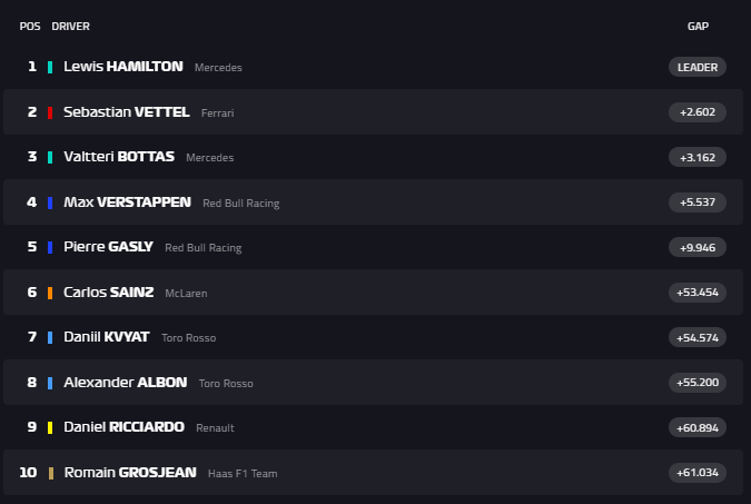 Uno dei più bei gran premi di Monaco visti negli ultimi anni lo vince Lewis Hamilton. L'inglese della Mercedes, su delle gomme gialle montate senza grande criterio dal suo team, resiste agli assalti di un aggressivo Max Verstappen. L'olandese, penalizzato, termina fisicamente 2°, ma materialmente 4°. Al secondo posto sale così un regolare Sebastian Vettel che al contatto Hamilton-Verstappen del 77° giro avrà pensato di potercela fare a salire sul gradino più alto. 3° Valtteri Bottas. Ritirato Charles Leclerc che aveva iniziato il Gp regalandoci sorpassi da fantascienza terminati purtroppo con un fondo rovinato e il conseguente ritiro dopo una foratura per un contatto con Hulkenberg. La classifica finale dei primi 10: